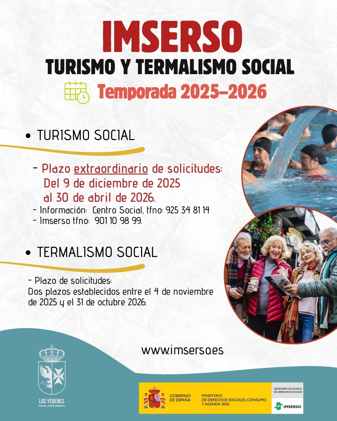 El Ayuntamiento de Los Yébenes informa de los plazos establecidos por el IMSERSO para la presentación de solicitudes de los programas de Turismo Social y Termalismo Social correspondientes a la temporada 2025–2026, dirigidos a personas mayores.